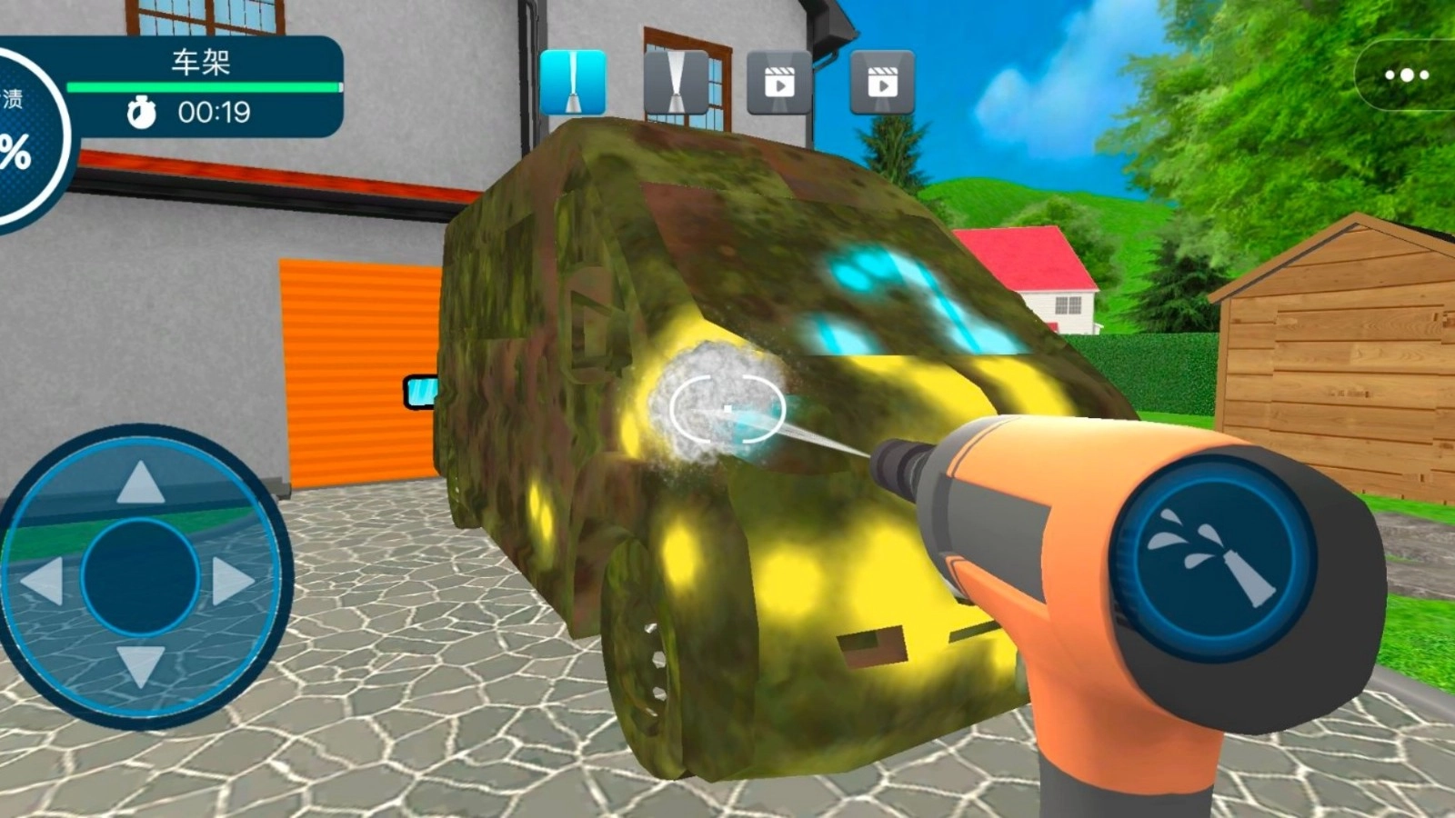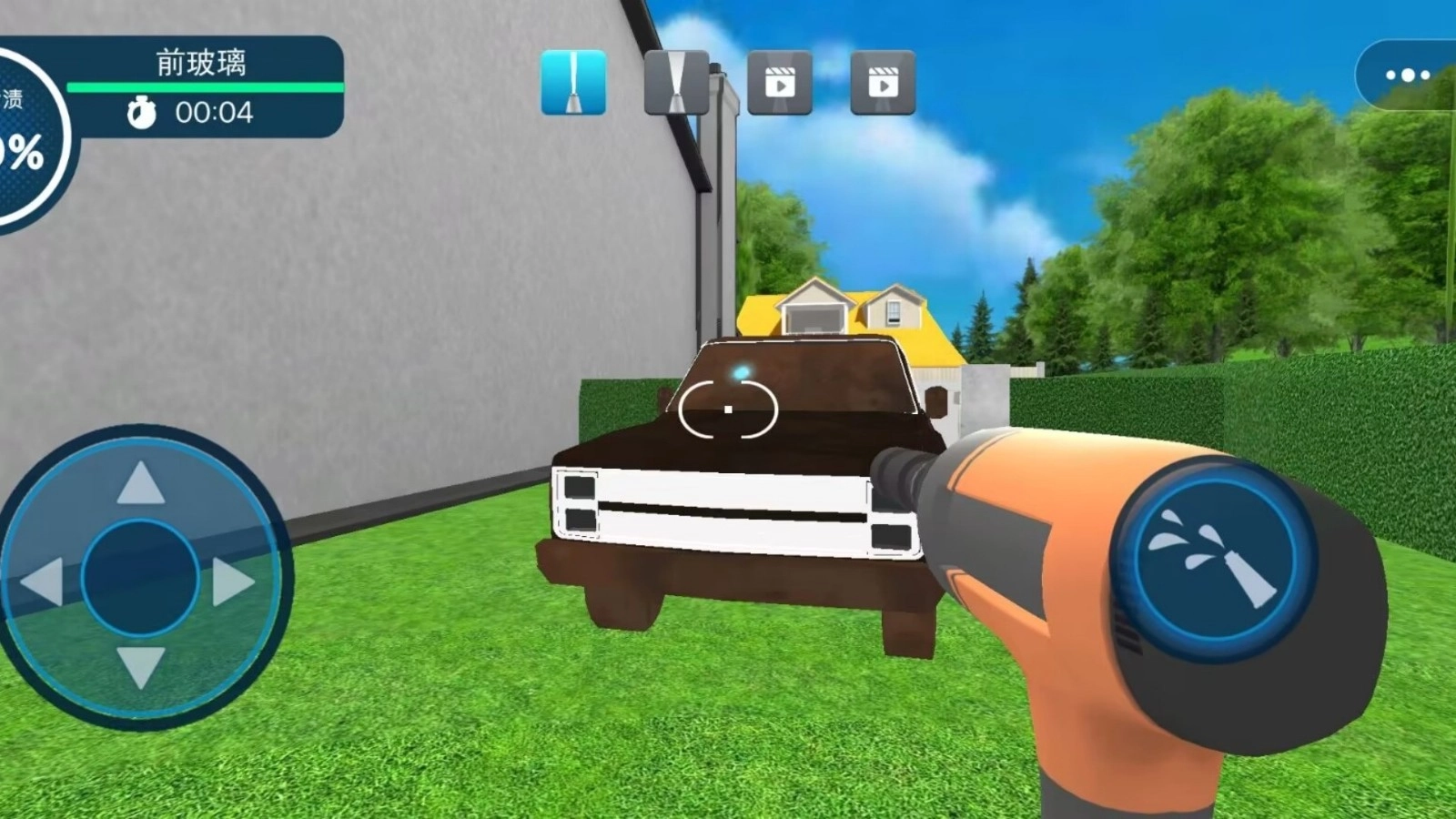 1.玩家第一步要做的是用高压水枪冲刷车身表面的脏污,针对不同的污垢严重程度和车身具体部位,需要调整水枪的水压大小和喷射角度来处理。