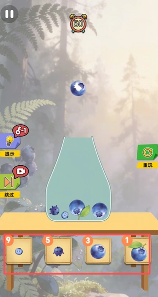 3、同时需留意屏幕上的倒计时,务必在时间结束前完成所有蓝莓的放入操作。