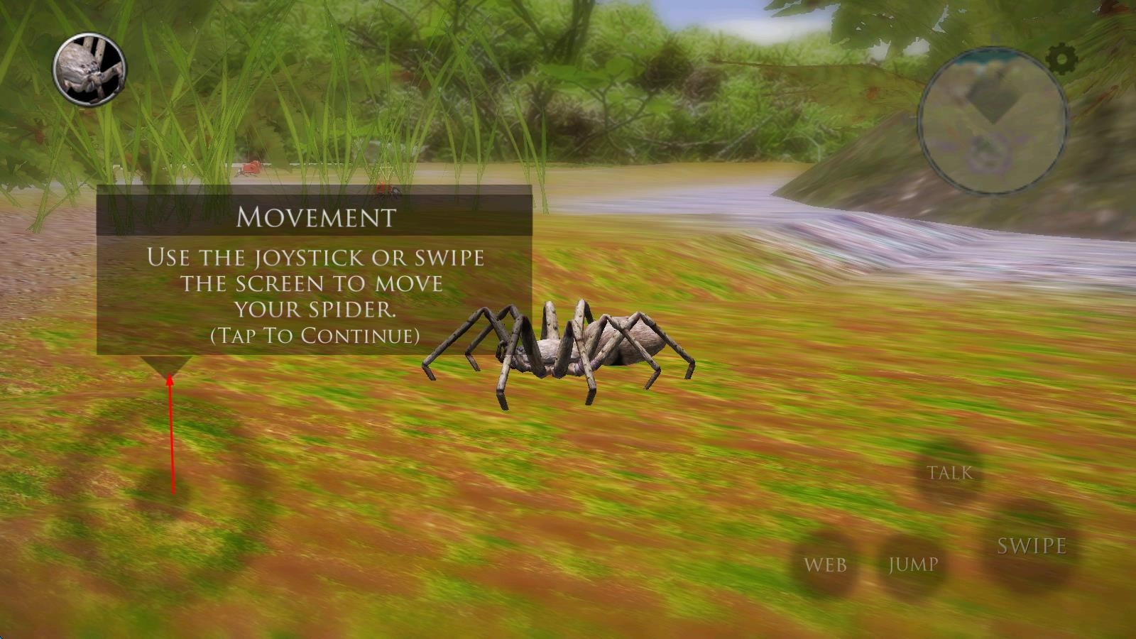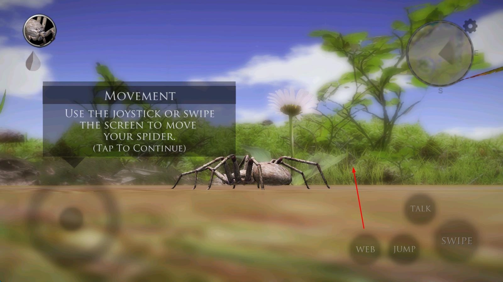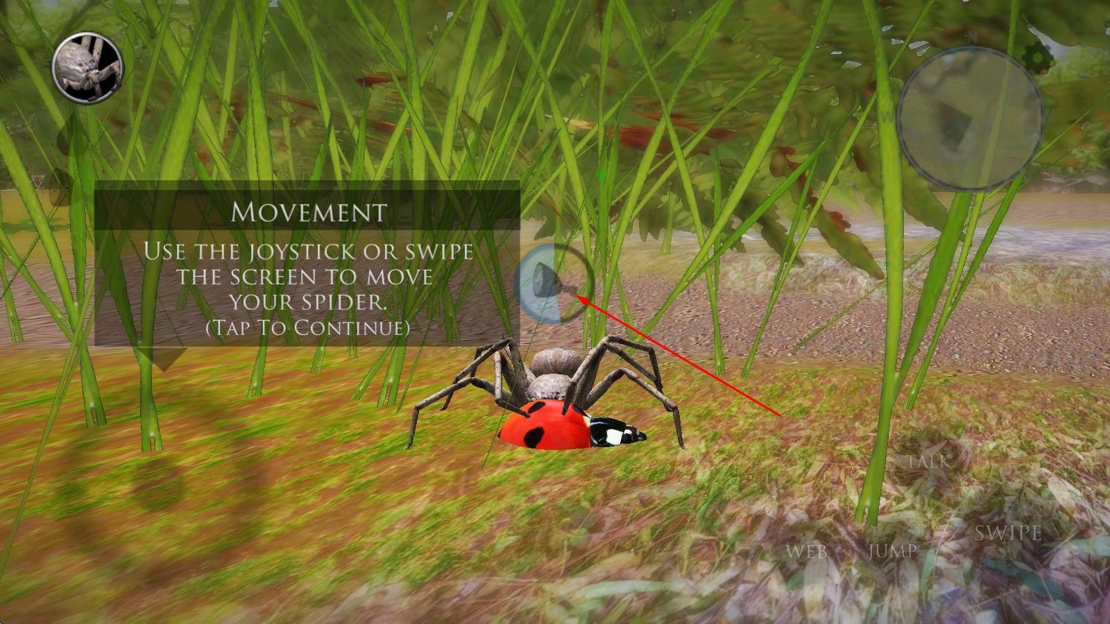 进入游戏后,挑选初始蜘蛛种类,在丛林场景里借助虚拟摇杆操控移动,使用吐丝按钮布置蛛网陷阱,静候昆虫进入捕猎区域。