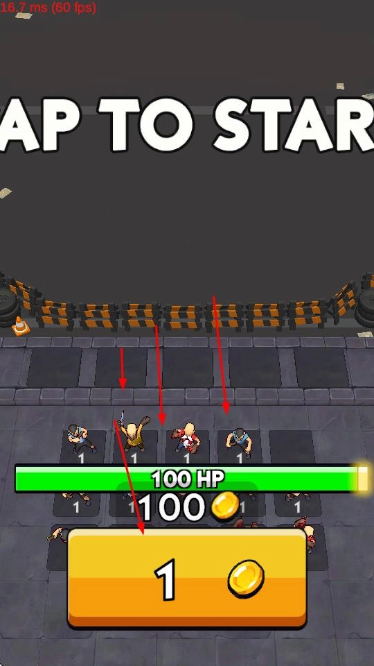 1、点击“TAPTOSTART”启动战斗,花费金币(例如1金币)在对应格子部署士兵,做好抵御僵尸的准备。