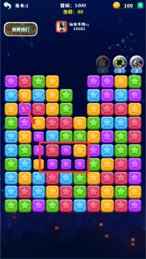 游戏开始后,找到颜色相同的星星并消除它们,尽可能一次性消除更多星星,这样能拿到更高的分数。
