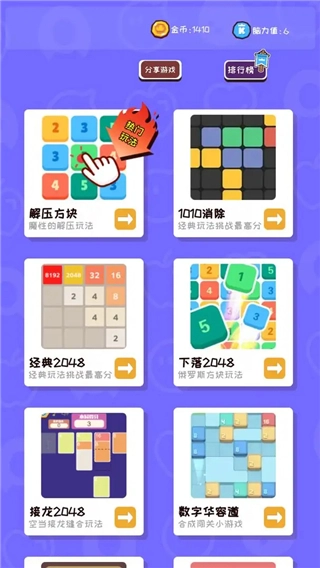 游戏内收录了丰富的休闲小游戏,像解压方块、1010消除、经典2048、接龙2048、数字华容道等都包含其中,无需网络连接,打开即可直接游玩,为你带来便捷的游戏体验。