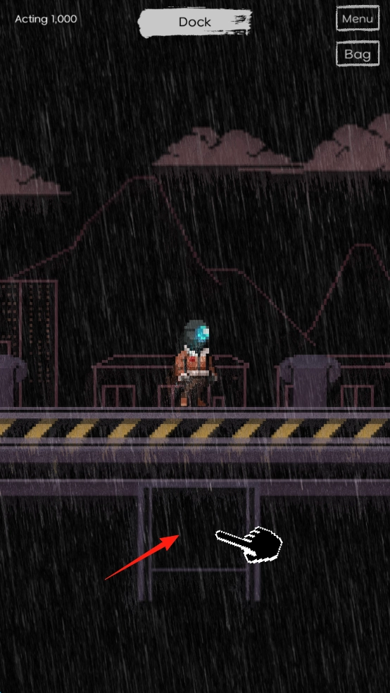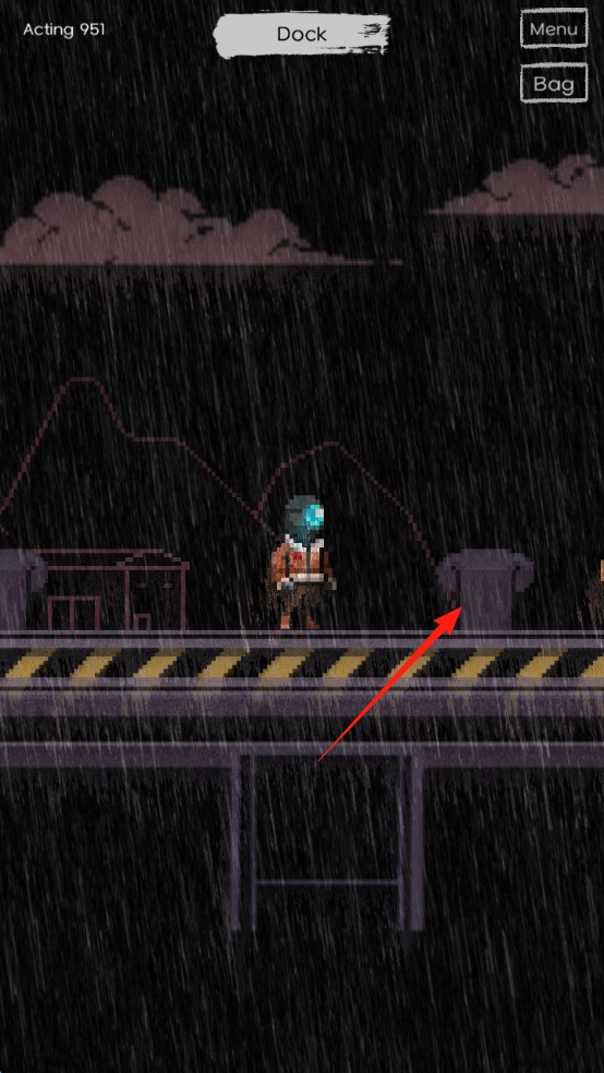 1、控制角色,在码头场景中移动,点击箭头所指的区域,探索周边环境,以此触发基础剧情(例如进入建筑)。