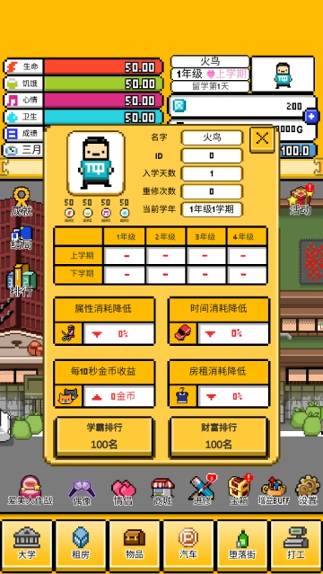五魁首我的留学生活游戏是一款模拟留学生活的像素风格模拟经营游戏,游戏里主角怀揣梦想远赴海外留学。要在游戏中实现梦想,玩家需要兼顾勤工俭学与学业完成,这并非易事,最终的留学生活体验将取决于玩家的每一次选择和不懈努力,快来看看你的留学生活会是什么样子吧。