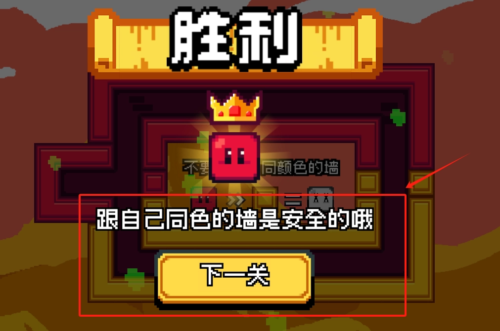 3、在胜利界面点击下一关,要记住同色的墙是安全的,而戴皇冠的红方块会提示过关。