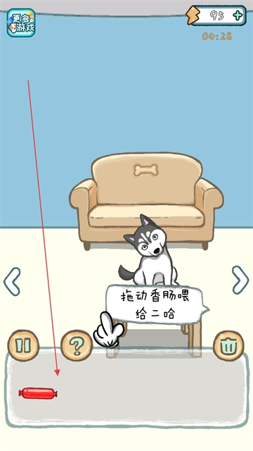 4、进入关卡后,根据提示拖动香肠喂给二哈,通过将屏幕下方的香肠拖到二哈所在位置来完成喂食,以此达成当前关卡的任务。