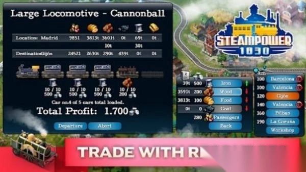 1、展示了列车运营数据界面,涵盖出发地、目的地、货物及利润等信息,玩家能在此开展资源贸易、列车调度等操作,感受铁路经营玩法。