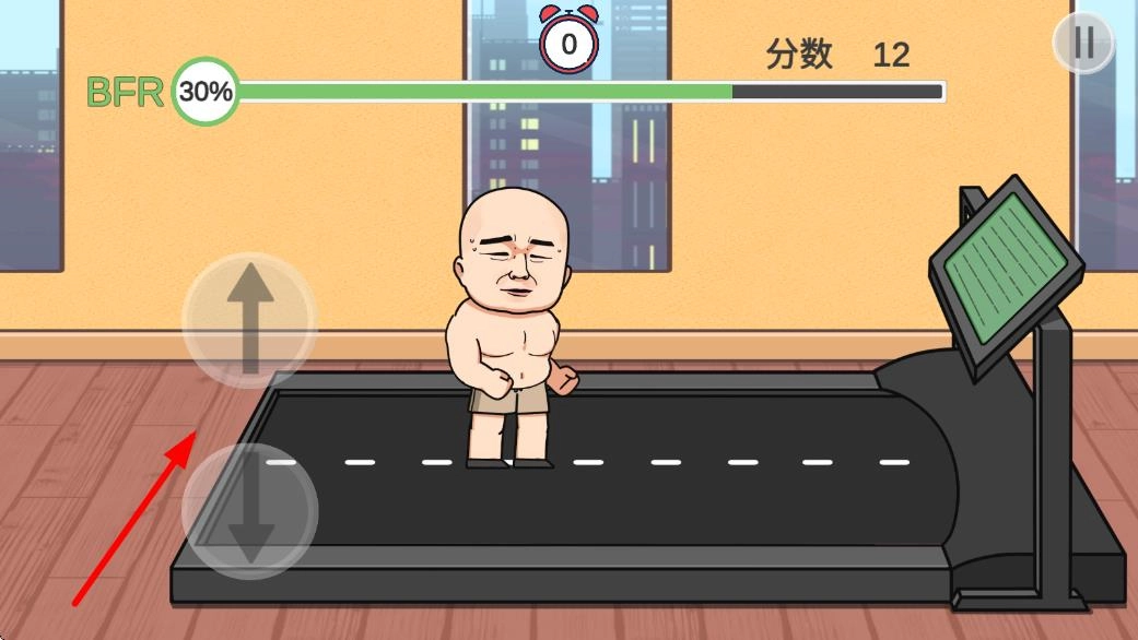 2、玩家需要快速连续点击屏幕右侧区域,点击速度越快,角色在跑步机上的奔跑速度就越快;与此同时,左手要随时准备按动屏幕左侧的上下箭头按钮,以此操控角色在三条横向跑道之间灵活移动,避开高热量的食物。