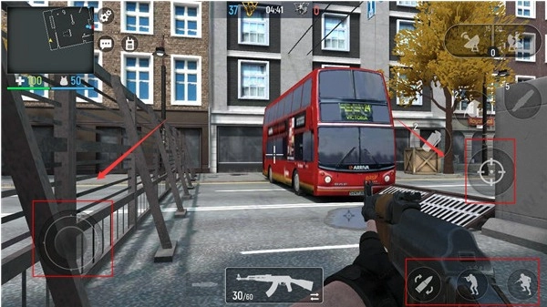 3、左侧摇杆用于操控角色移动,右侧摇杆负责射击操作,右下角还设有跳跃和下蹲按钮。