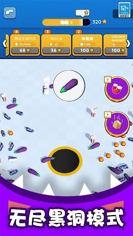1、在这款游戏里,玩家要操控黑洞吞噬周边的物品,在规定时间内积分最高的玩家将赢得最终胜利。