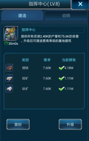 在整个基地里,指挥中心绝对是最核心的建筑,它既是运营调度的大脑,也是其他设施升级的先决条件。每当指挥中心顺利升阶,既能提升资源储备的上限,还能开放更多高级建筑的建造权限,是基地发展过程中必不可少的关键部分。