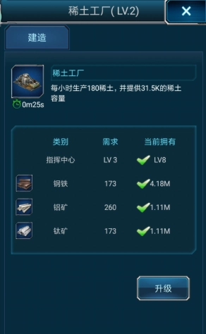 在稀土工厂里,产量的多少直接取决于工厂自身的等级。对工厂进行升级,不仅可以增加每小时稀土的产出量,还能扩大储存空间。但升级时,除了要耗费资源,还得达到指挥中心的等级要求,所以在规划建设方面需要仔细盘算。