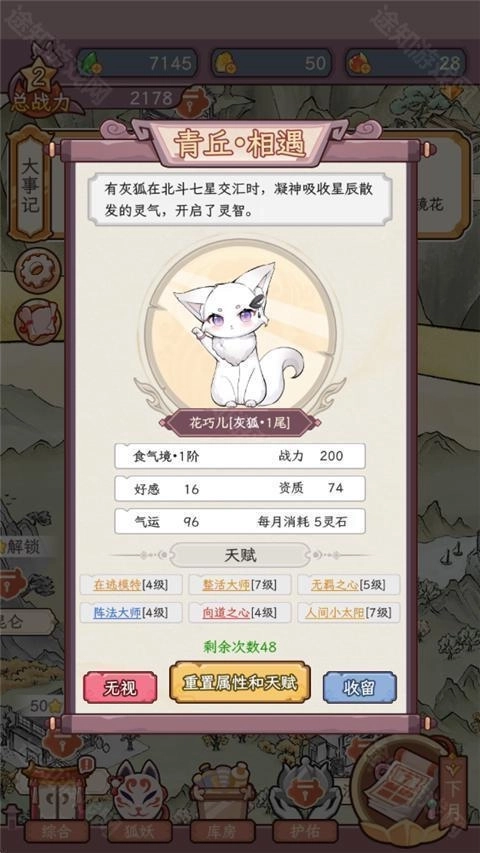 2、小狐狸具备自带属性,玩家能够对其属性和天赋进行重置。