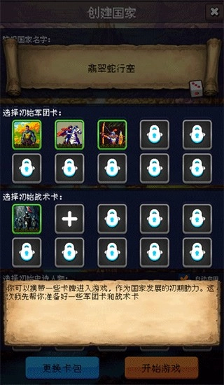 1、玩家在创建自己的国家时,能够携带部分卡牌作为初期助力进入游戏。