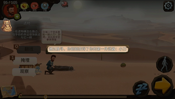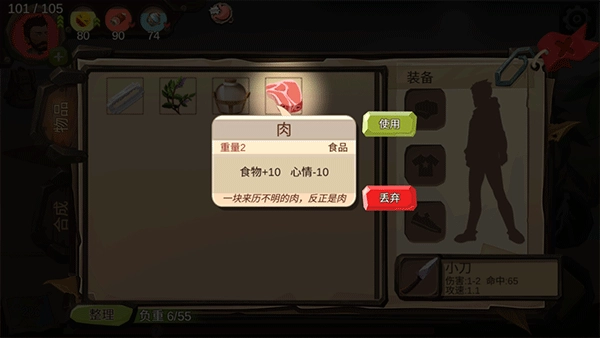 9、战斗获胜后会得到资源,像肉这类,既能补充你的饥饿值,也能改善心情;