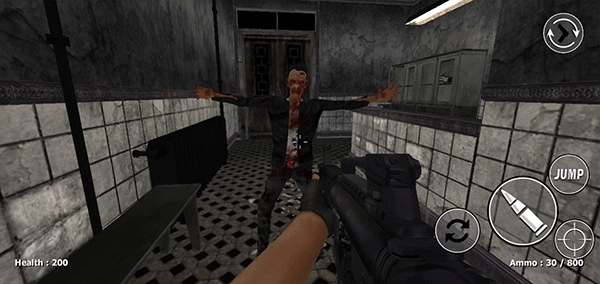 3、游玩过程中,左侧屏幕区域用于控制角色移动,右侧则分布着换弹、射击、跳跃和瞄准的按键,玩家可通过这些按键进行游戏操作。