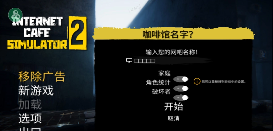 1、在主界面点击“新游戏”选项,给网吧起个名字后点击“开始”按钮。