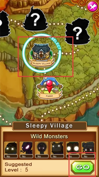 4、在地图界面找到【SleepyVillage】区域并选中,查看推荐等级无误后,点击【GO】按钮即可前往该区域进行探索。