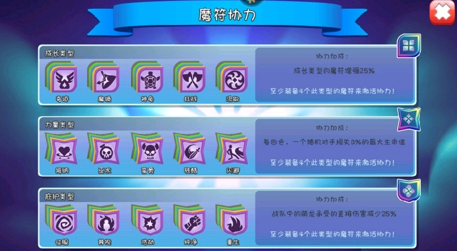 第四种是奇迹接纳,这套魔符组合是神圣龙的专属配置,堪称灵魂搭配,能提升神圣龙的生命值与攻击力(金属反伤流派也适用)。不过它不太适合其他龙类,效果比较有限,顶多就是多回复些血量或是让土盾更坚固一点,实际作用不大。