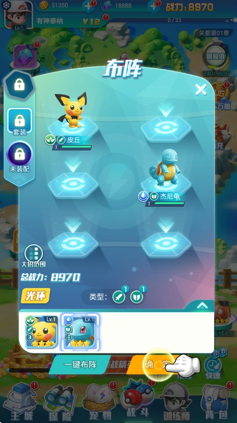 3、玩家获取新精灵后,需将其编入队伍才能参与战斗。要注意的是,游戏设有前后排机制,杰尼龟防御能力出色,属于前排定位的精灵。