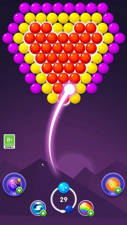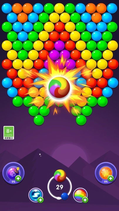 1、借助简易的触控操作,玩家可操控泡泡发射器,对准目标发射泡泡,通过连接同色泡泡实现消除。