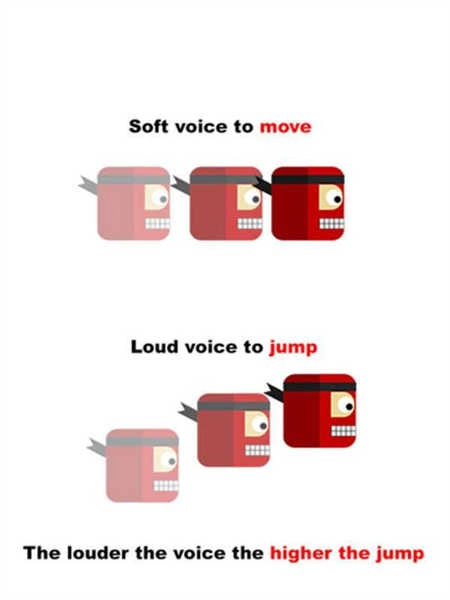 玩家可通过调节音量的大小来操控忍者的动作,音量越大,忍者的跳跃高度就越高,游戏进程也会越快。玩家需要把控好声音的强度,从而顺利躲避障碍物。