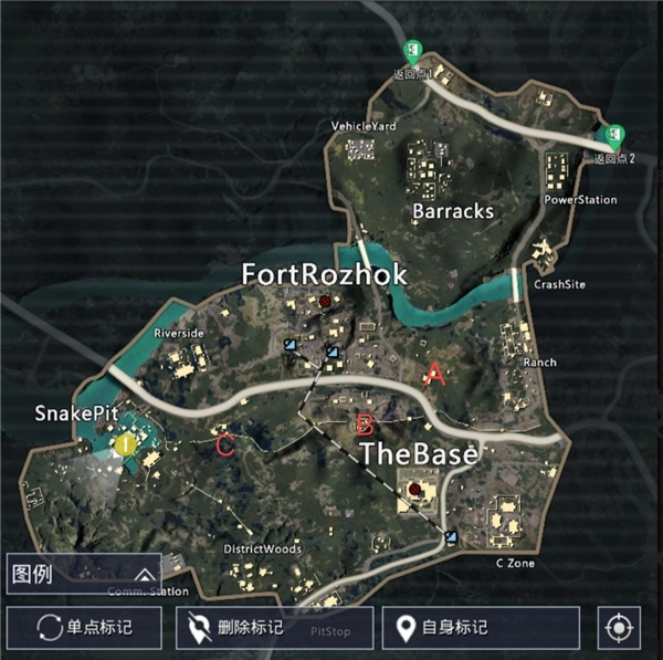 C点这里能从那块倾斜的围墙跳上来,BOSS会卡在这儿,注意围墙上那个位置,会把你挤下去。