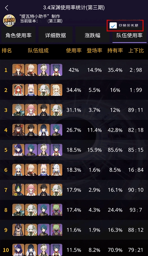 3、还可以只看五星角色等等。