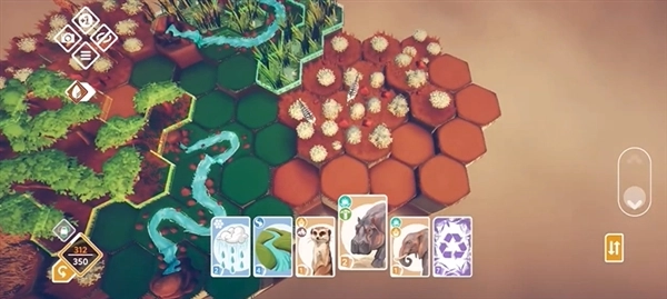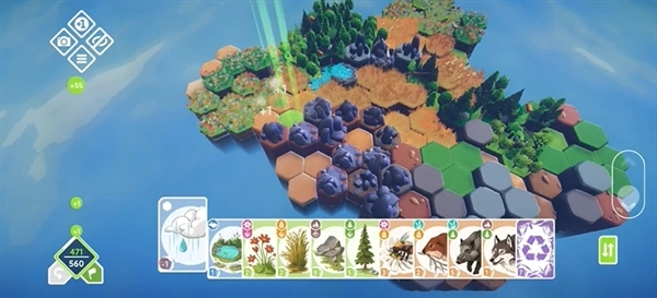 2、玩家在六边形格子上放置“环境卡片”(森林、湿地、珊瑚礁等),通过堆叠不同生态单元构建立体栖息地,建造范围覆盖从地表到高空的各个空间。