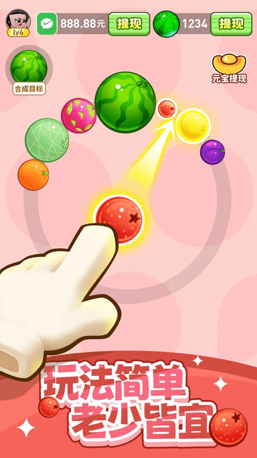 2、核心玩法采用祖玛消除模式,只要通过合成消除水果达成关卡目标就能获得红包奖励,消除的水果数量越多,对应的红包金额也会越高。