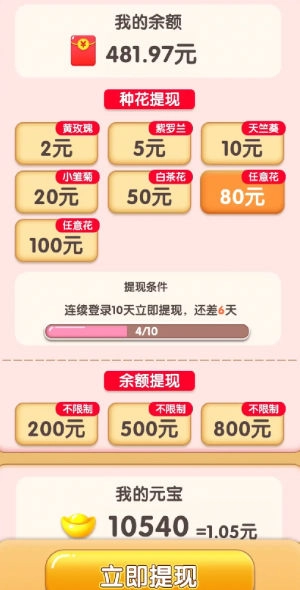 四季养花游戏是一款轻松有趣的模拟经营类手机游戏,适合各个年龄段的玩家,尤其受到喜爱花卉和经营类游戏人群的青睐。在游戏里,玩家既能感受到养花过程中的乐趣与挑战,还能和好友互动交流,分享养花的经验与成果。要是你正想找一款兼具趣味性与挑战性的模拟经营类手机游戏,四季养花游戏无疑是个值得尝试的好选择。