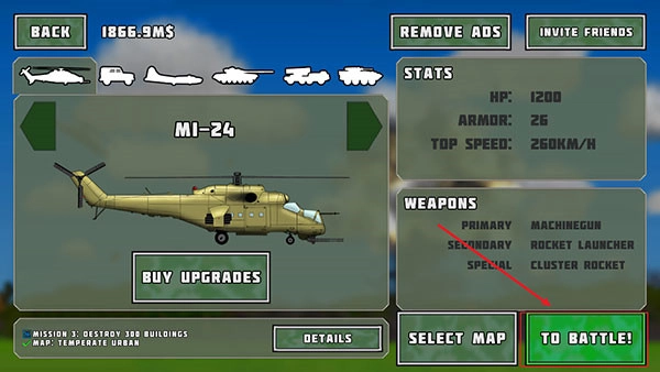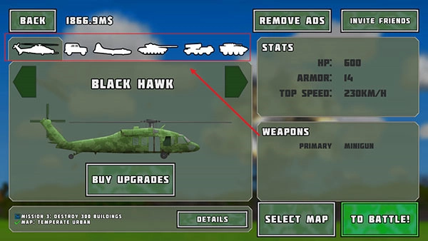 1、在游戏里,战斗开始前我们能够挑选各式各样的载具,像直升机、汽车、坦克之类的都可以选。