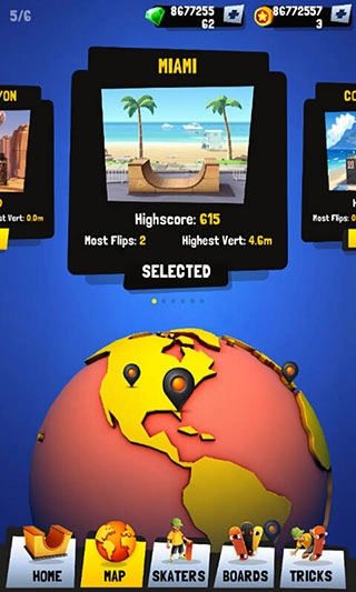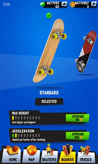 壮观的董事会,从众多可能性中挑选您最喜爱的电路板,确保你滑冰风格,解锁板的升级,以确保您的分数最大化。游戏提供超过50种可定制滑板,从经典款到概念款应有尽有,每块滑板都拥有独特的性能参数和外观设计。