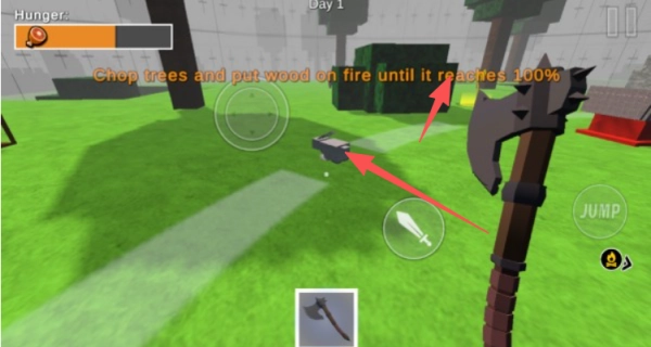 2、在新手引导环节,系统会教授基础的生存操作,其中首要任务是长按收集按钮来积攒足够的树枝,之后点击火把图标来生起篝火。