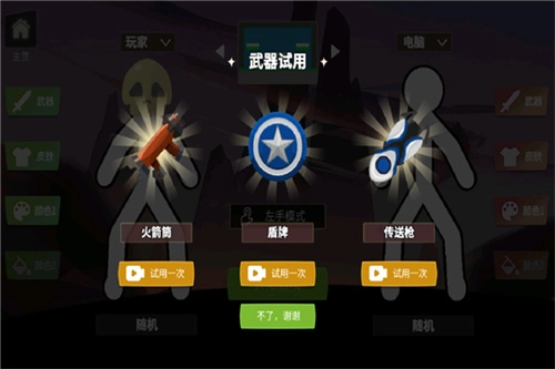 2、对战开始前,两位玩家能够挑选各自的火柴人角色,并为其配备不同的武器与皮肤。