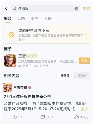 1、打开王者营地,搜索“王者荣耀体验服”,也可以直接搜索“王者荣耀体验服”