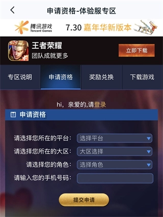 2、点击顶部的“体验服申请与”选项,按要求填写申请资格所需的资料就可以了(注意:仅安卓系统支持,苹果系统无法申请)