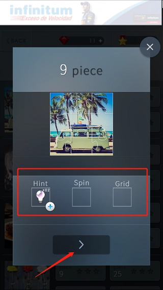 3、选择游戏难度:其中Hint表示游戏提示,Spin意味着提升难度并解锁图片,Grid则是取消网格显示。