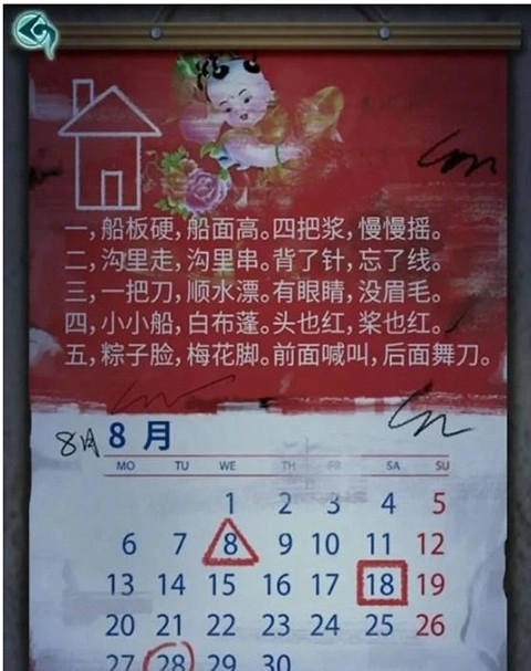 走到院子里,把米糕递给女童后,水缸就能靠近了,看来之后会用到水。正对着的房屋也可以进去了,进去看了看,原来是间库房。先检查纸人右边的木板,上面提示要一物换一物;再看纸人手里的托盘,上面写着不许直接拿墨块,那我们把木炭放到托盘里,应该就能取走墨块了。右边的日历藏着不少线索,先记一下能看到的数字:三角形代表8,正方形代表18,圆形代表28,至于日历上方的解谜部分,等后面结合其他线索再看。