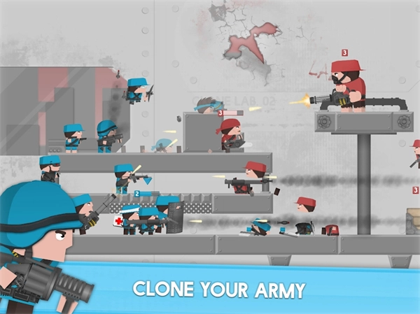 这款策略模拟对战游戏有着独特的玩法机制:玩家将通过1v1对战展开较量,每次被击败后,不仅会以普通士兵身份重返战场,被击倒的瞬间还会立即在战场上生成一个克隆体继续作战。随着阵亡次数增加,克隆体数量不断累积,胜负的关键在于哪一方的克隆军团先失去作战能力。获胜后,玩家可以升级兵种提升战力,通过合理搭配道具,能更高效地取得胜利。