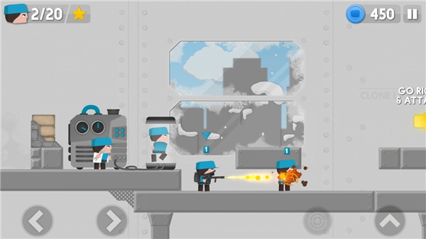 在游戏中,玩家可操控由博士复制出的专属战斗单位,通过左侧操作区调整其移动方向,右侧则负责射击指令与向上跳跃动作的触发。