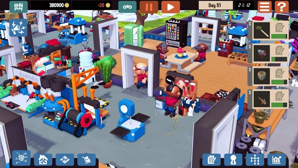 装饰度方面,这里补充说明一下前面提到的大厂房问题。游戏里每个房间都有装饰度属性,装饰度越低,工人需要休息的频率就越高(游戏内表现为工人头顶的电量条下降更快)。因此建议开局前先把各房间的装饰和休息室布置妥当,再开始接订单和招募工人。房间的装饰度可以通过点击右上角的房间装饰度按钮,然后将鼠标移到对应房间查看具体数值。 关于厂房类型的装饰度影响:大厂房的套内面积(不含墙体)在100-200之间,会带来-25的装饰度惩罚;巨大厂房的套内面积超过200,装饰度惩罚为-50。不过奖杯道具能让装饰效果翻倍,本身还自带装饰属性,有了它前期甚至不用划分太多隔间,直接用巨大厂房就行——这样既能提高空间利用率,也方便小人在厂房内移动,后续扩建时只需规划好地块拆墙即可(否则还要额外建门、重新购置一套装饰品)。另外游戏里的装饰遵循减倍原则,我个人的经验是每个房间每种装饰品买两套就足够用了。