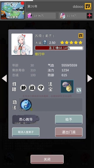 入室弟子能够加快修炼进度,一旦某个入室弟子达到当前境界上限,便不会再积累经验,要记得解除其入室弟子身份,以便给其他有需要的弟子。