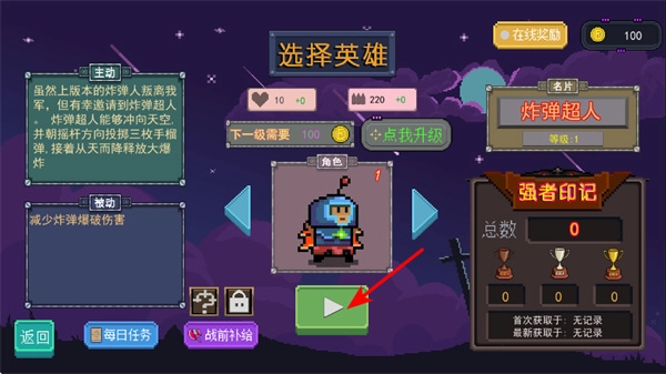 选择英雄炸弹超人,这个英雄拥有投掷炸弹与释放大爆炸的技能,属于战斗核心角色。