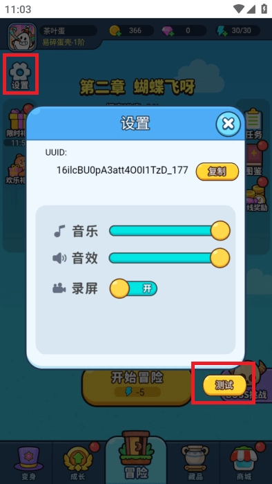 回到游戏的主页面,我们点击设置,然后再下面找到测试点击进去。