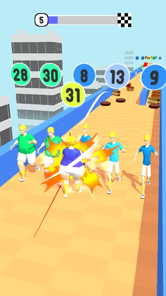 小人头上有初始数字,我们要操纵小人移动吃掉前面出现的大量食物,增大自己的体型,变大头上的数字。