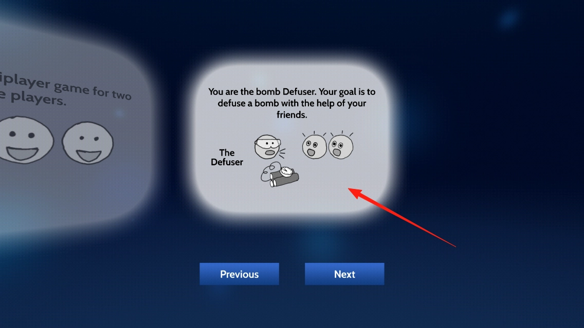 你要扮演拆弹者,目标是和朋友一起拆炸弹,先看这页说明,明白自己角色任务,点Next进入下一段规则介绍,准备和朋友协作挑战。