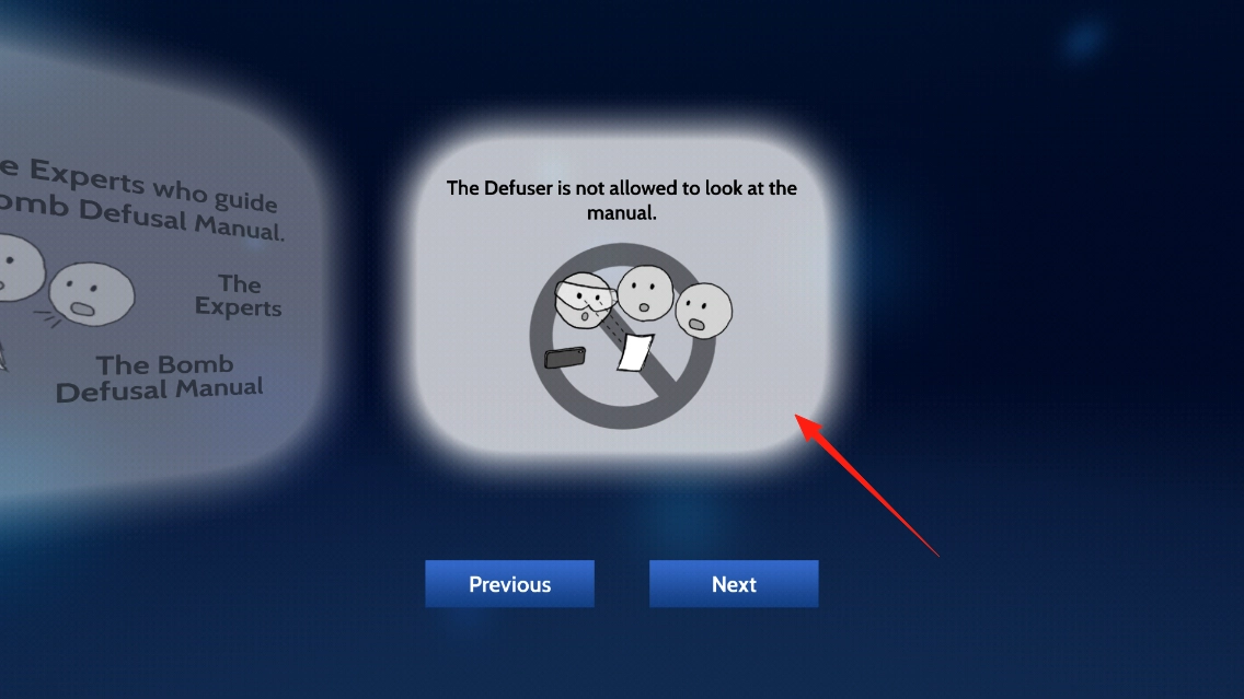 你的朋友是专家,他们会用拆弹手册指导你,了解这层分工后,点Next继续记好朋友和手册在流程里的作用,为后续配合做准备。