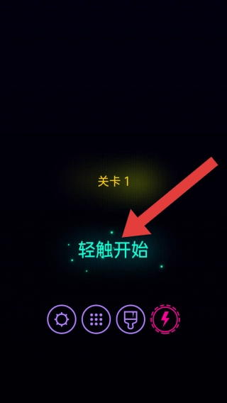 根据界面文字提示:轻触开始,点击后可开启关卡1进入场景进行游玩,还有其余图标根据需求进行点击。
