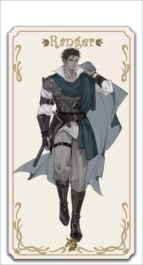 为完成某项任务踏入森林的游侠,身上带着玩世不恭的洒脱、豪放不羁的自在,还有几分嬉皮笑脸的浪子模样。他居无定所,从不对人提及自己的来处与去向,偶尔会给人一种游手好闲、无所事事的印象。